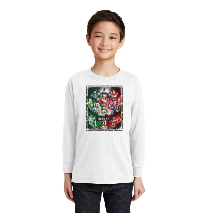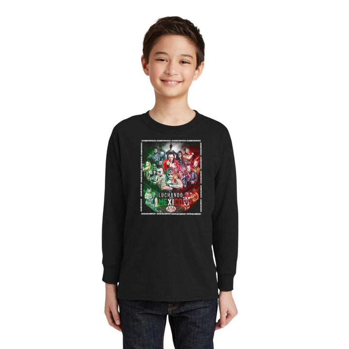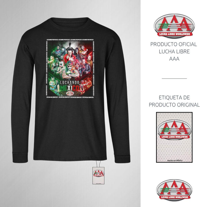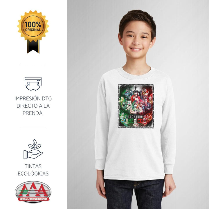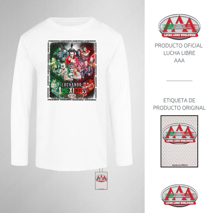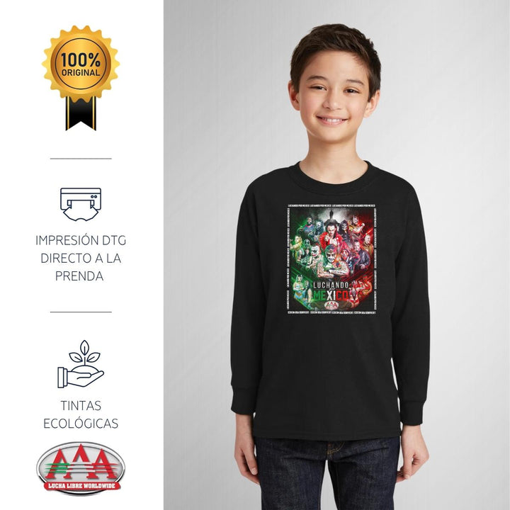 Playera infantil manga larga, cuello redondo para niño o niña nueva Lucha Libre AAA oficial, diseño Evento Luchando por México original impreso con tecnología DTG (directo a la prenda) tacto cero, uso casual o deportiva, 100% algodón, estructura tubular sin costuras laterales. Colores de camiseta: Negro, Blanco.