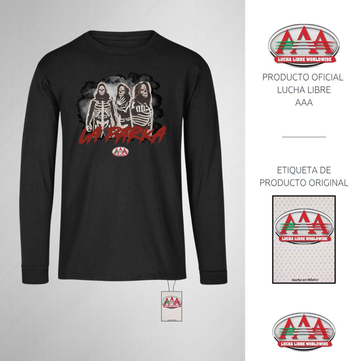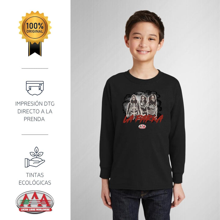 Playera infantil manga larga, cuello redondo para niño o niña nueva Lucha Libre AAA oficial, diseño La Parka Luchador original impreso con tecnología DTG (directo a la prenda) tacto cero, uso casual o deportiva, 100% algodón, estructura tubular sin costuras laterales. Colores de camiseta: Negro, Blanco.