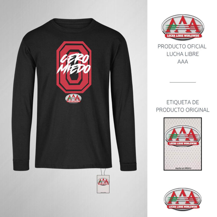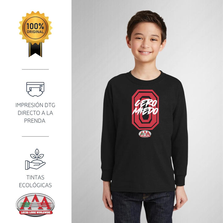 Playera infantil manga larga, cuello redondo para niño o niña nueva Lucha Libre AAA oficial, diseño Pentagón Jr 0 Miedo original impreso con tecnología DTG (directo a la prenda) tacto cero, uso casual o deportiva, 100% algodón, estructura tubular sin costuras laterales. Colores de camiseta: Negro.