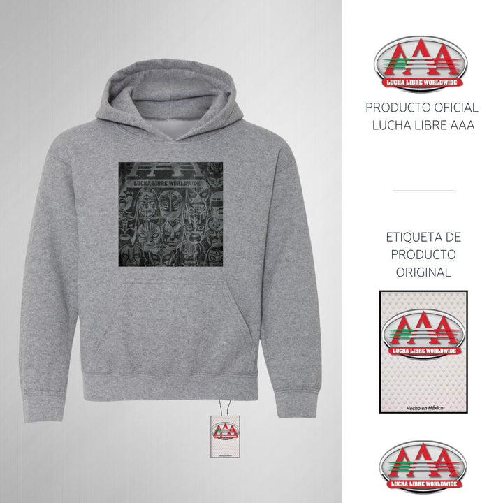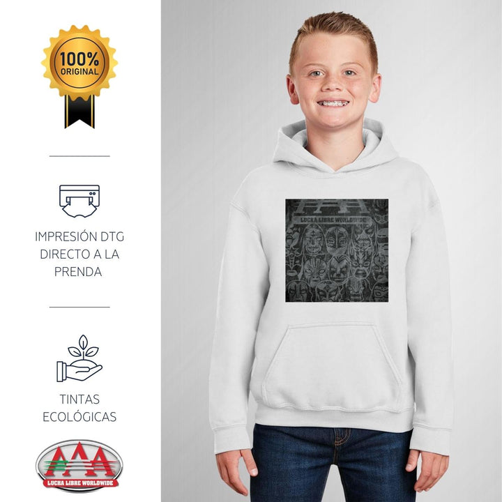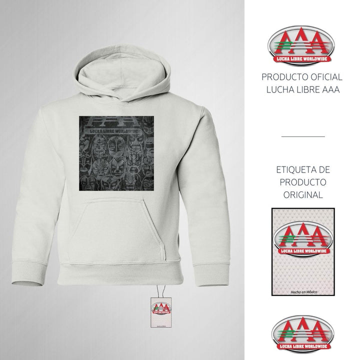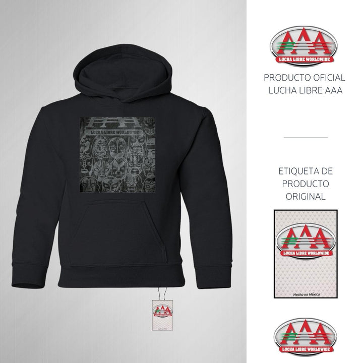 Sudadera hoodie infantil con gorro o capucha y bolsillo frontal canguro nueva, para niño o niña, Lucha Libre AAA oficial, diseño Collage original impreso con tecnología DTG (directo a la prenda) tacto cero, uso casual o deportiva, 50% algodón y 50% poliéster fleece pre encogido, estructura tubular con ajuste clásico. Colores de sudadera: Negro, Blanco, Gris.