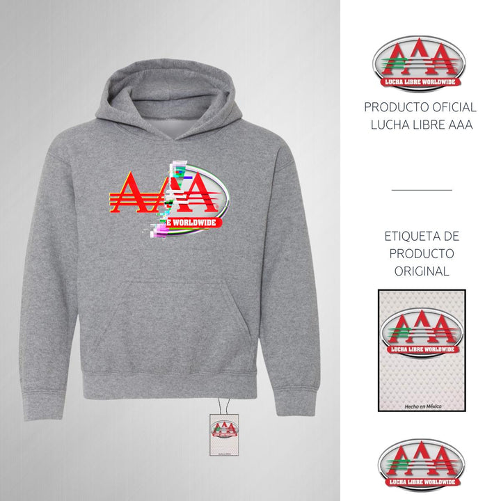 Sudadera hoodie infantil con gorro o capucha y bolsillo frontal canguro nueva, para niño o niña, Lucha Libre AAA oficial, diseño Glitch original impreso con tecnología DTG (directo a la prenda) tacto cero, uso casual o deportiva, 50% algodón y 50% poliéster fleece pre encogido, estructura tubular con ajuste clásico. Colores de sudadera: Negro, Blanco, Gris.