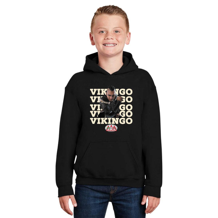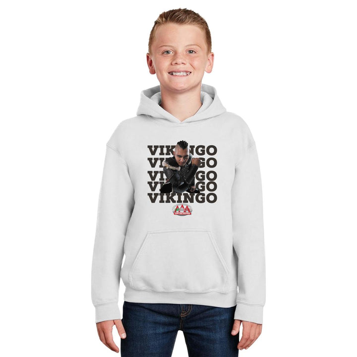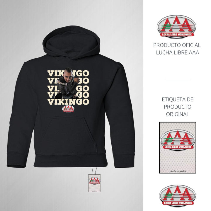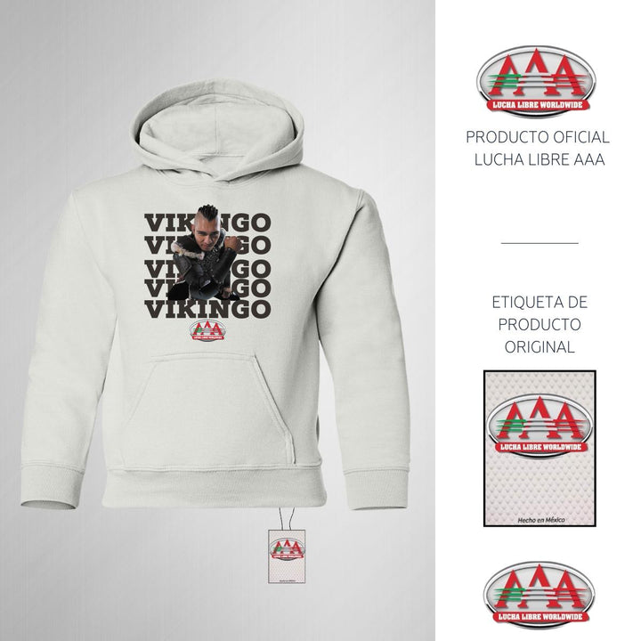 Sudadera hoodie infantil con gorro o capucha y bolsillo frontal canguro nueva, para niño o niña, Lucha Libre AAA oficial, diseño Hijo del Vikingo original impreso con tecnología DTG (directo a la prenda) tacto cero, uso casual o deportiva, 50% algodón y 50% poliéster fleece pre encogido, estructura tubular con ajuste clásico. Colores de sudadera: Negro, Blanco, Gris.