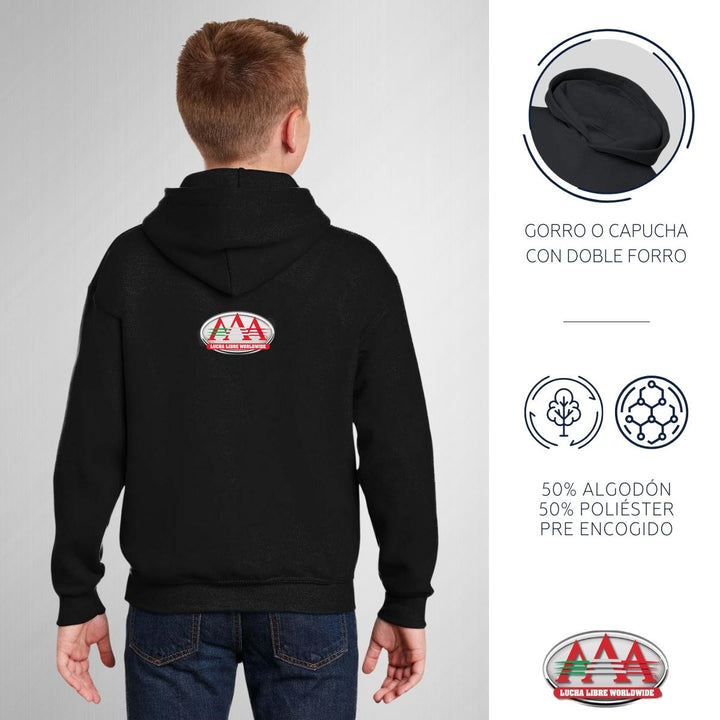 - ORIGINALIDAD Y SOSTENIBILIDAD: Sudadera infantil con capucha. Producto Oficial con un diseño original de Lucha Libre AAA impreso con tecnología DTG (directo a la prenda) tacto cero. Se utilizan tintas ecológicas sin contaminantes que se adhieren a las fibras de la ropa, garantizando calidad, colores vivos e imagen de larga duración en la sudadera sin comprometer el planeta. La sudadera cuenta con etiqueta y holograma que garantiza un producto 100% original de Lucha Libre AAA.