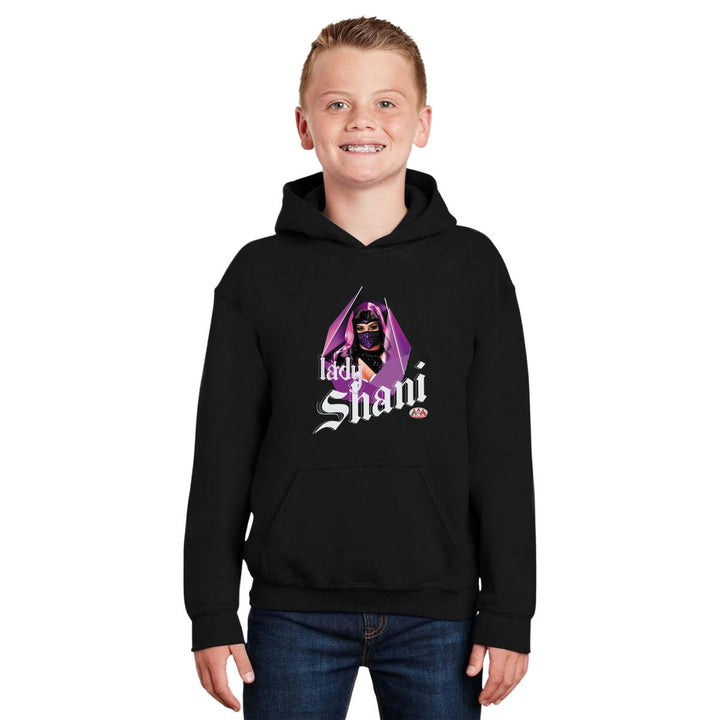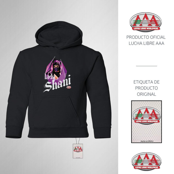 Sudadera hoodie infantil con gorro o capucha y bolsillo frontal canguro nueva, para niño o niña, Lucha Libre AAA oficial, diseño Lady Shani original impreso con tecnología DTG (directo a la prenda) tacto cero, uso casual o deportiva, 50% algodón y 50% poliéster fleece pre encogido, estructura tubular con ajuste clásico. Colores de sudadera: Negro.