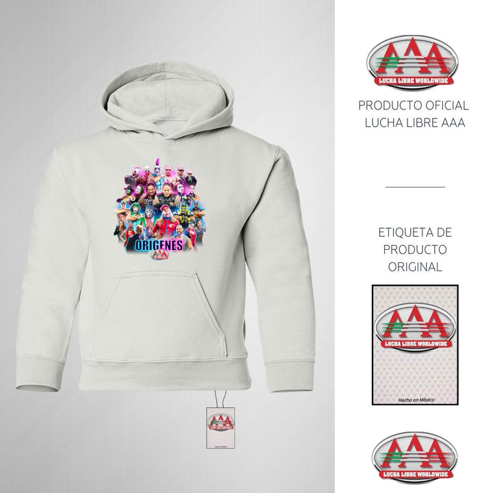 Sudadera hoodie infantil con gorro o capucha y bolsillo frontal canguro nueva, para niño o niña, Lucha Libre AAA oficial, diseño Orígenes CDMX original impreso con tecnología DTG (directo a la prenda) tacto cero, uso casual o deportiva, 50% algodón y 50% poliéster fleece pre encogido, estructura tubular con ajuste clásico. Colores de sudadera: Negro, Blanco, Gris.