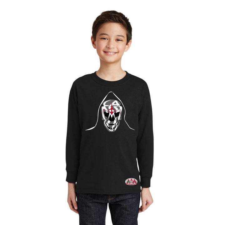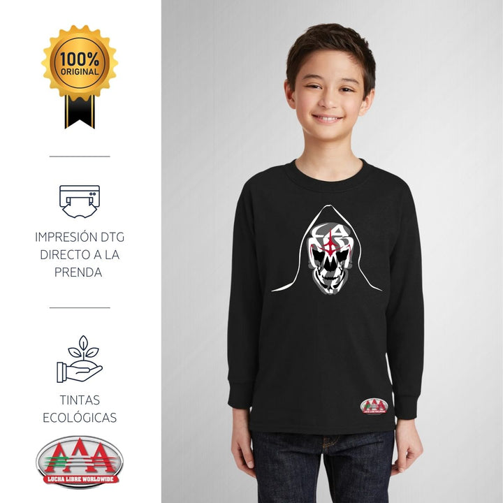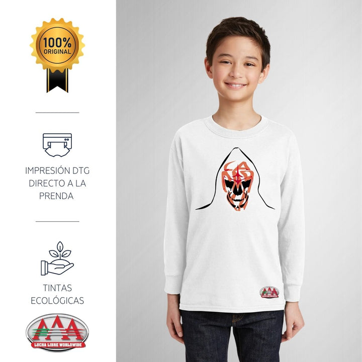Playera infantil manga larga, cuello redondo para niño o niña nueva Lucha Libre AAA oficial, diseño La Parka 1 Fan original impreso con tecnología DTG (directo a la prenda) tacto cero, uso casual o deportiva, 100% algodón, estructura tubular sin costuras laterales. Colores de camiseta: Negro, Blanco.