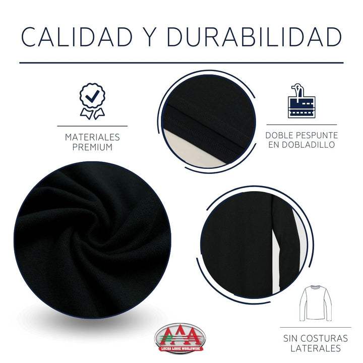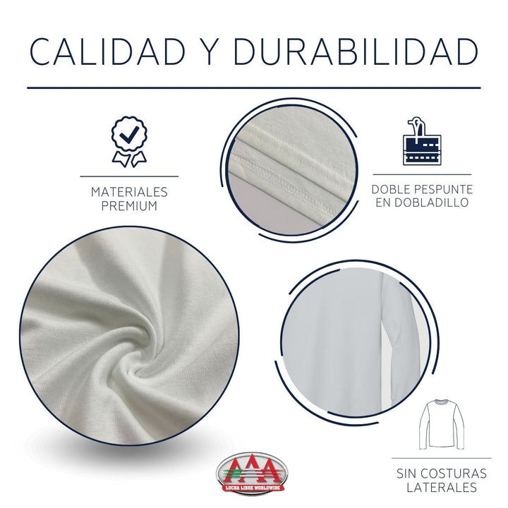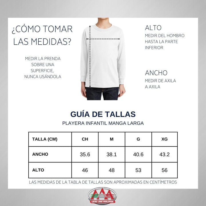 - ORIGINALIDAD Y SOSTENIBILIDAD: Playera infantil de manga larga. Producto Oficial con un diseño original de Lucha Libre AAA impreso con tecnología DTG (directo a la prenda) tacto cero. Se utilizan tintas ecológicas sin contaminantes que se adhieren a las fibras de la ropa, garantizando calidad, colores vivos e imagen de larga duración en la camiseta sin comprometer el planeta. La playera cuenta además con etiqueta que garantiza un producto 100% original de Lucha Libre AAA.