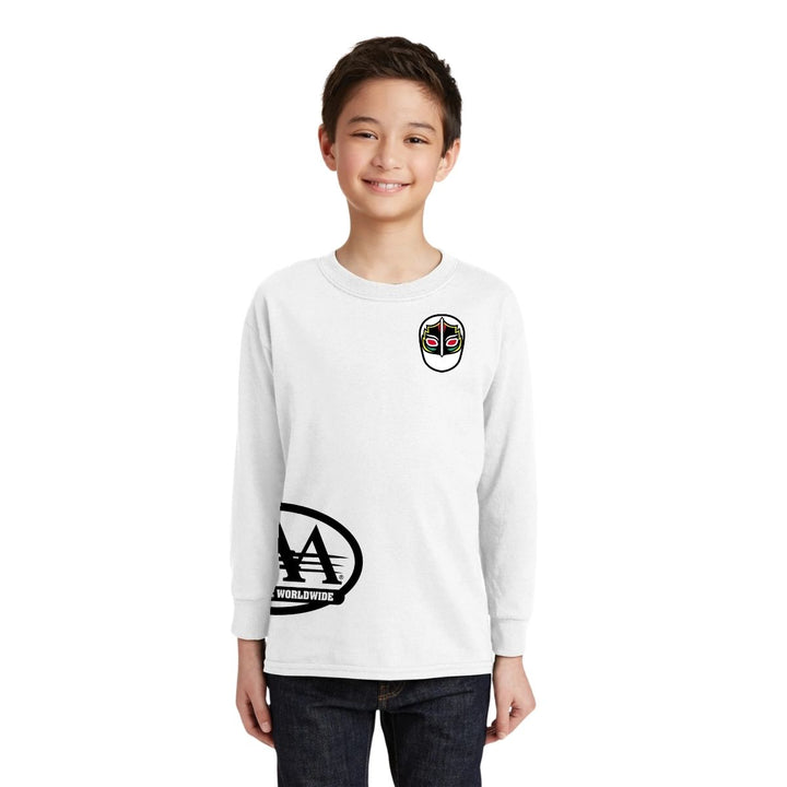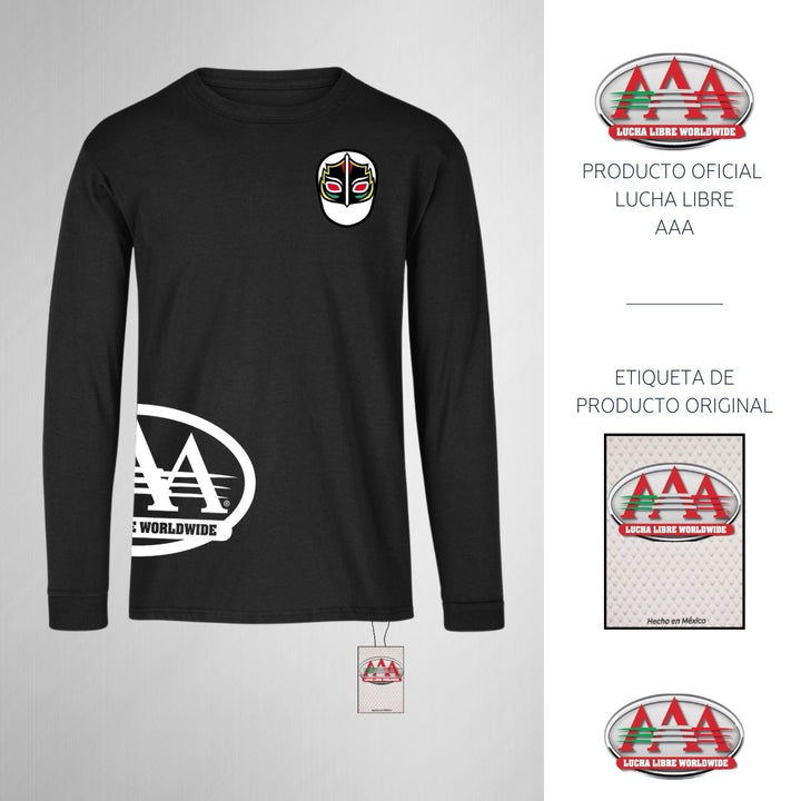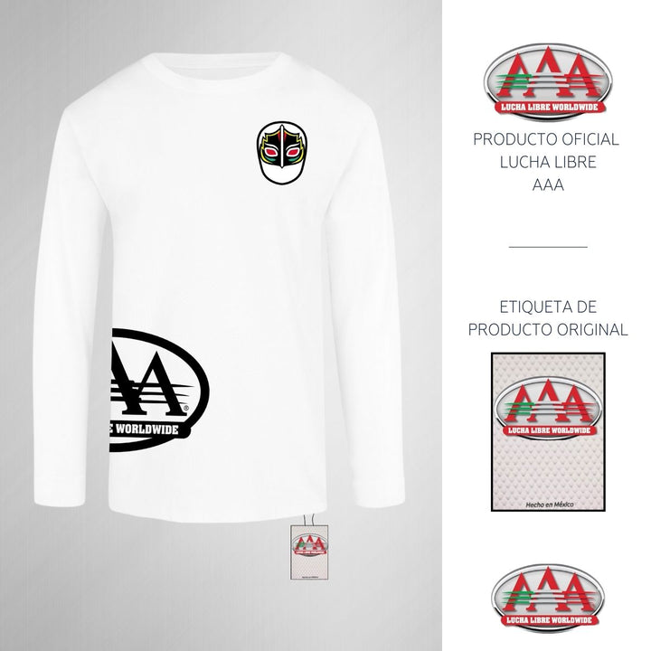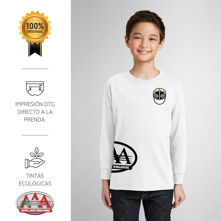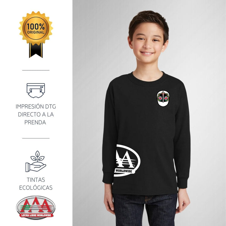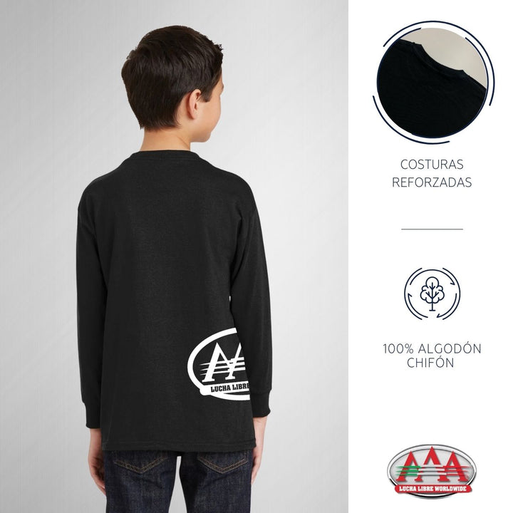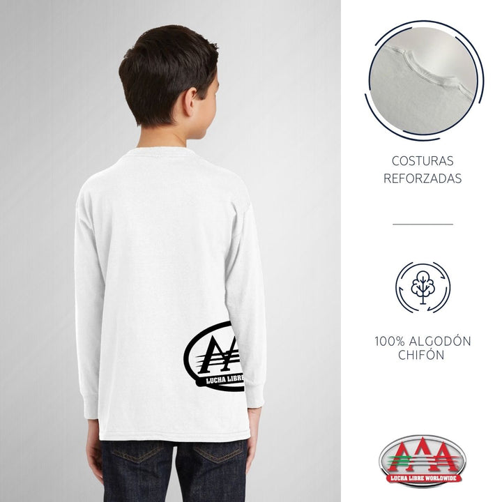 Playera infantil manga larga, cuello redondo para niño o niña nueva Lucha Libre AAA oficial, diseño Mascarita Sagrada Lateral original impreso con tecnología DTG (directo a la prenda) tacto cero, uso casual o deportiva, 100% algodón, estructura tubular sin costuras laterales. Colores de camiseta: Negro, Blanco.