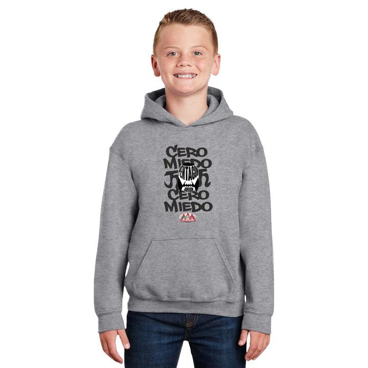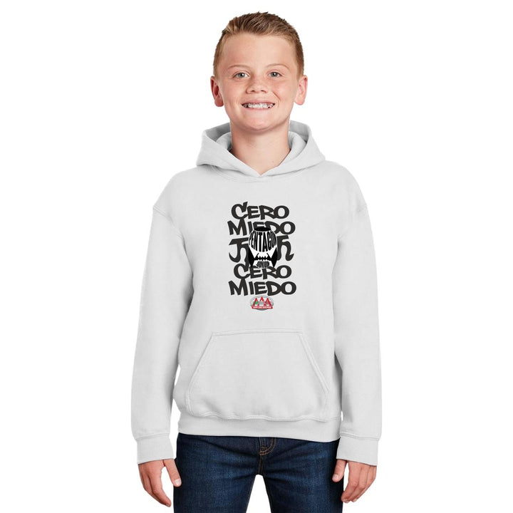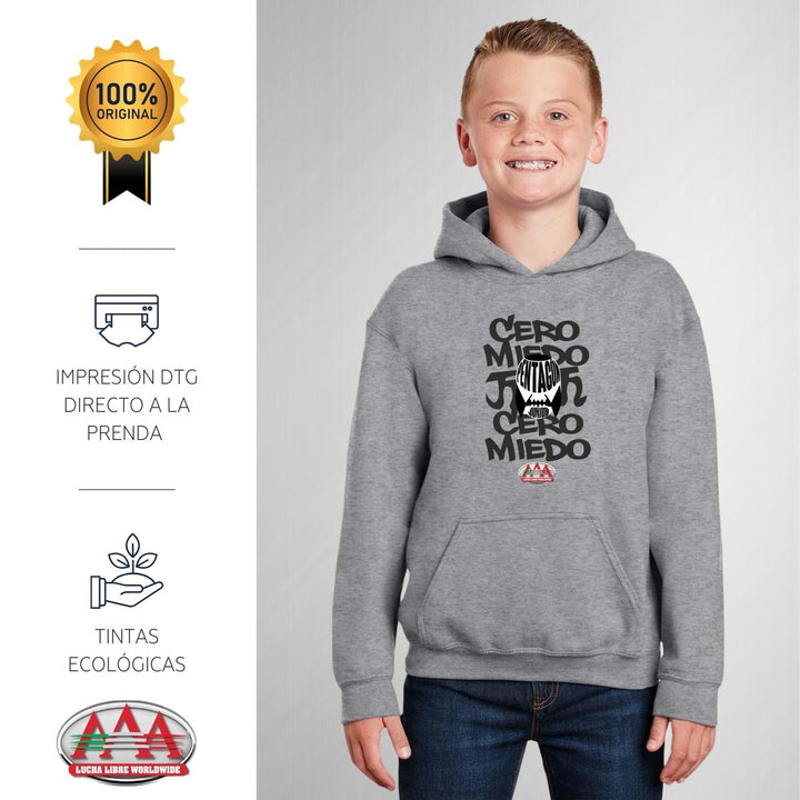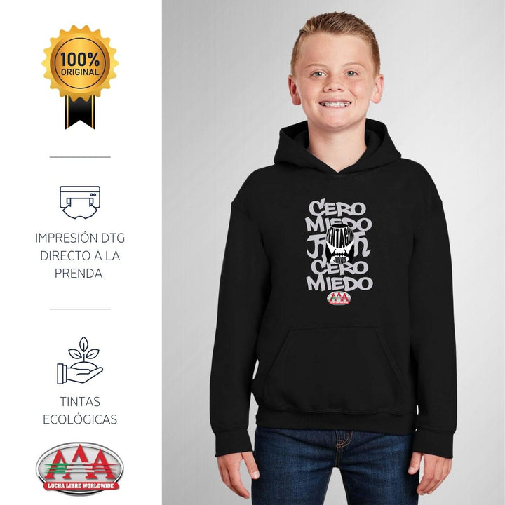 Sudadera hoodie infantil con gorro o capucha y bolsillo frontal canguro nueva, para niño o niña, Lucha Libre AAA oficial, diseño 0 Miedo Pentagón Jr original impreso con tecnología DTG (directo a la prenda) tacto cero, uso casual o deportiva, 50% algodón y 50% poliéster fleece pre encogido, estructura tubular con ajuste clásico. Colores de sudadera: Negro, Blanco, Gris.