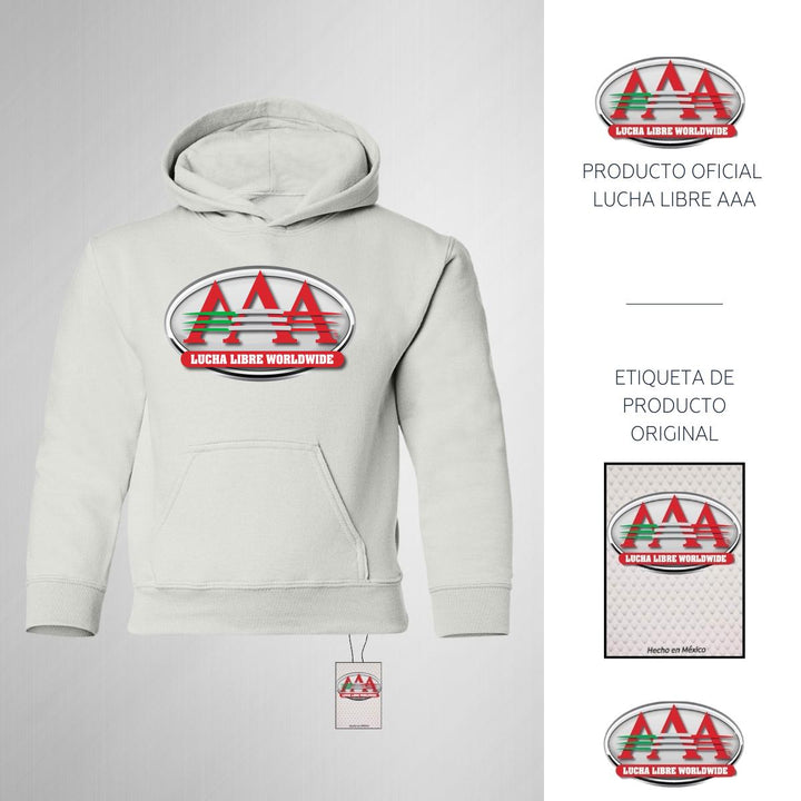 Sudadera hoodie infantil con gorro o capucha y bolsillo frontal canguro nueva, para niño o niña, Lucha Libre AAA oficial, diseño Estilo AAA original impreso con tecnología DTG (directo a la prenda) tacto cero, uso casual o deportiva, 50% algodón y 50% poliéster fleece pre encogido, estructura tubular con ajuste clásico. Colores de sudadera: Negro, Blanco, Gris.