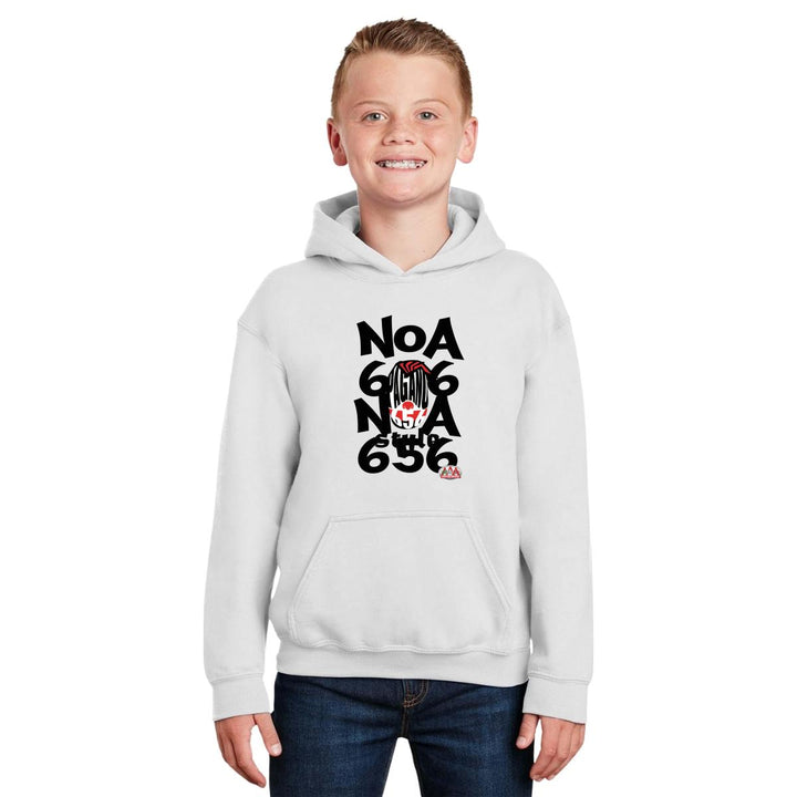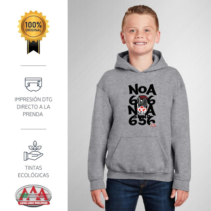 Sudadera hoodie infantil con gorro o capucha y bolsillo frontal canguro nueva, para niño o niña, Lucha Libre AAA oficial, diseño Pagano Noa 656 original impreso con tecnología DTG (directo a la prenda) tacto cero, uso casual o deportiva, 50% algodón y 50% poliéster fleece pre encogido, estructura tubular con ajuste clásico. Colores de sudadera: Negro, Blanco, Gris.