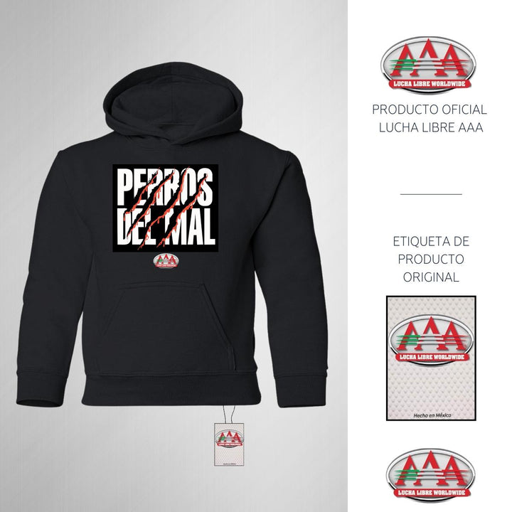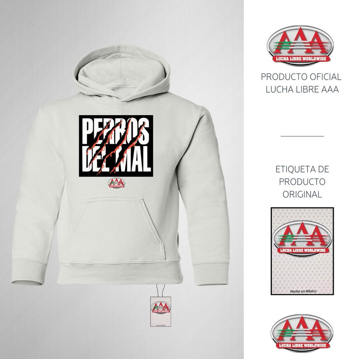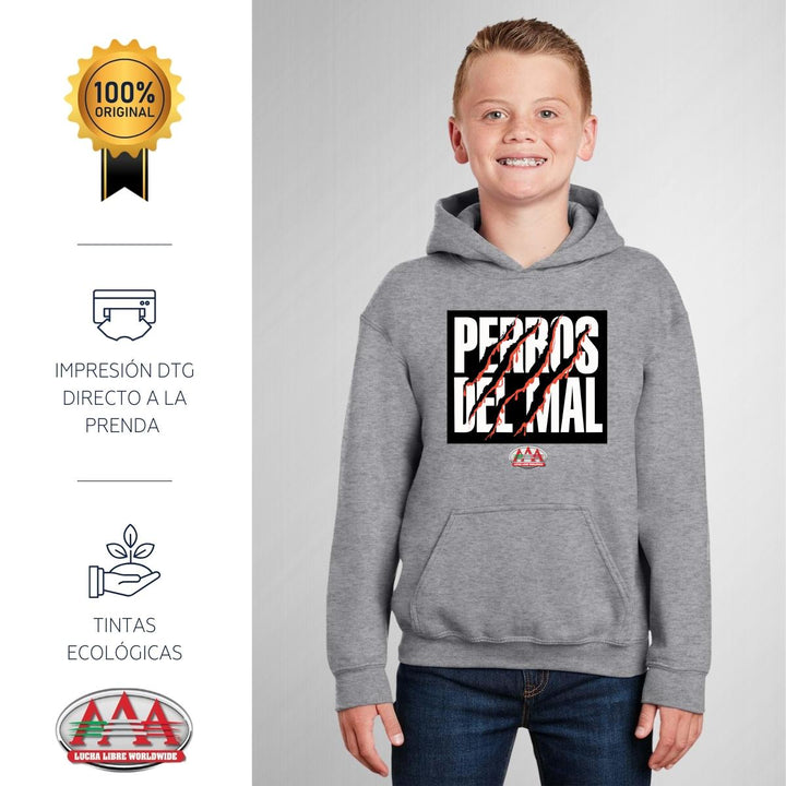 Sudadera hoodie infantil con gorro o capucha y bolsillo frontal canguro nueva, para niño o niña, Lucha Libre AAA oficial, diseño Perros del mal original impreso con tecnología DTG (directo a la prenda) tacto cero, uso casual o deportiva, 50% algodón y 50% poliéster fleece pre encogido, estructura tubular con ajuste clásico. Colores de sudadera: Negro, Blanco, Gris.
