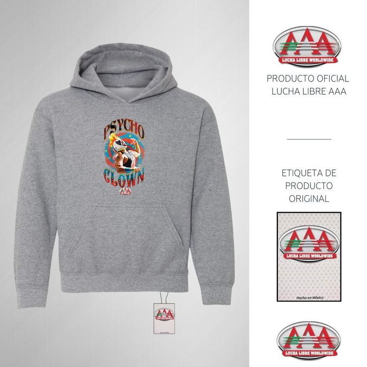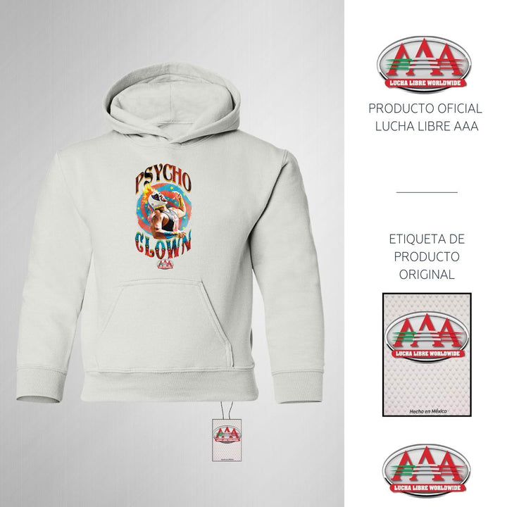 Sudadera hoodie infantil con gorro o capucha y bolsillo frontal canguro nueva, para niño o niña, Lucha Libre AAA oficial, diseño Psycho Clown Luchador original impreso con tecnología DTG (directo a la prenda) tacto cero, uso casual o deportiva, 50% algodón y 50% poliéster fleece pre encogido, estructura tubular con ajuste clásico. Colores de sudadera: Negro, Blanco, Gris.