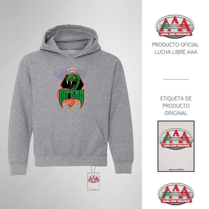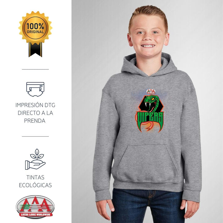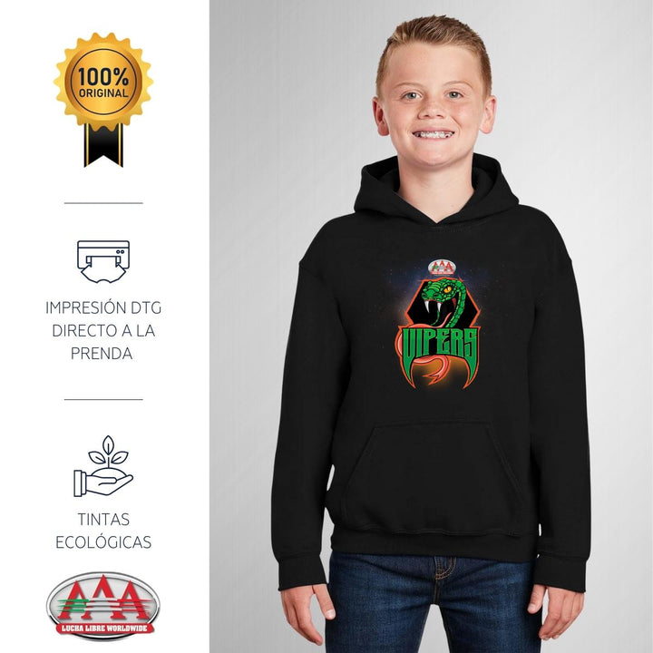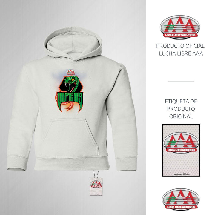 Sudadera hoodie infantil con gorro o capucha y bolsillo frontal canguro nueva, para niño o niña, Lucha Libre AAA oficial, diseño Vipers original impreso con tecnología DTG (directo a la prenda) tacto cero, uso casual o deportiva, 50% algodón y 50% poliéster fleece pre encogido, estructura tubular con ajuste clásico. Colores de sudadera: Negro, Blanco, Gris.